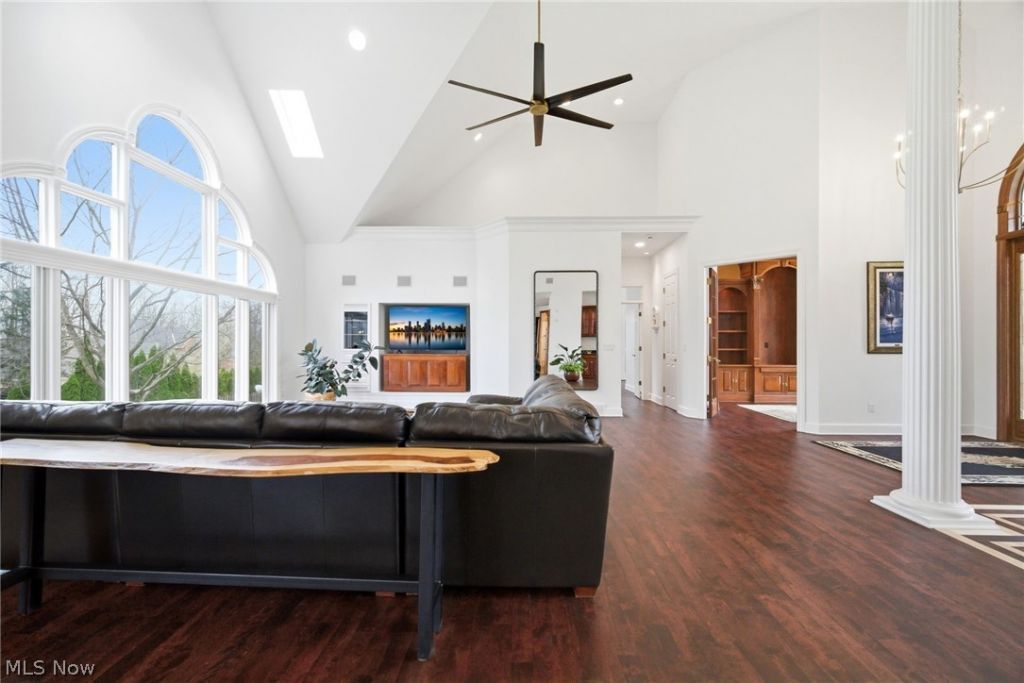 A masterpiece of custom design nestled in North Royalton's Sherwood Highlands neighborhood. Noticing the heightened quality is unavoidable, immediately upon arrival. Approach the property, slowing past neighboring homes of similar caliber, surpassing $1.2M in value in a recent sale. The calm of a fountain brings ease while hand-carved carrera marble lions stand watch beside a newly added stoop that brings welcome to all. A retractable screen tucks away providing access to the towering 8' entry door. Stepping inside, EVERYTHING IN SIGHT IS A FEATURE: soaring 18' ceilings w a new chandelier at the entry, custom cherry waxed hardwood flooring w in-laid accent design, a grand palladian window wall ahead, a trayed dining room ceiling w crown molding to the left, a library/office to the right w 8' French doors, a gourmet kitchen w atrium styled eating space & a newly renovated wood burning fireplace. Stow away the computer in the office, adorned w coffered ceilings, massive windows & built-in cabinetry! Pass by the half bath on the way to the your suite. The airy feel from the 14' vaulted ceiling relaxes your mood as you walk into the large closet for whatever outfit the day calls for next. Maybe a soak in the new tub, a rinse in the oversized shower or a quick visit to the double vanity is in order. Open the slider to the Juliet balcony for fresh air & head to the kitchen for your fav drink & snack! On the way, set the tone for the day w music isolated to your space or played throughout the home, thanks to whole-home built-in Boston Acoustic speakers that additionally service the newer composite deck out back! Those snacks are hidden away in the pantry's two new 10' tall cabinets. Indulge in the atrium styled breakfast nook, surrounded by windows & seated under skylights. Your family arrives, entering from the 3 car garage & disbursing to their private suites w renovated bathrooms, large closets & triple pane windows that are predominant throughout. Make this real today!